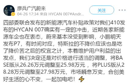最為直爽的就是廣汽蔚來的廖兵,直接在微博宣布調(diào)價(jià)。其中,BASE版本補(bǔ)貼后售價(jià)由26.26萬元調(diào)整至25.98萬元,PLUS版本補(bǔ)貼后售價(jià)由28.28萬元調(diào)整至27.98萬元,已經(jīng)下大定的車主也可享受這一價(jià)格。至于調(diào)價(jià)的原因,廖兵提到是源于補(bǔ)貼政策的壓力。調(diào)價(jià)當(dāng)然是消費(fèi)者最為喜聞樂見的事,對(duì)于僅僅發(fā)布售價(jià)半個(gè)月的HYCAN 007來說,趕在交付前進(jìn)行調(diào)價(jià)也許是對(duì)消費(fèi)者負(fù)責(zé)任的表現(xiàn),不會(huì)出現(xiàn)老車主維權(quán)的情況。