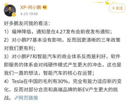 小鵬汽車CEO何小鵬表示,新政對(duì)小鵬P7基本沒有影響,反而更清晰的三年政策對(duì)小鵬更有利,特別是對(duì)小鵬智能汽車的商業(yè)體系也更為利好??梢钥闯雒鎸?duì)多方面的壓力,何小鵬還是充滿信心。