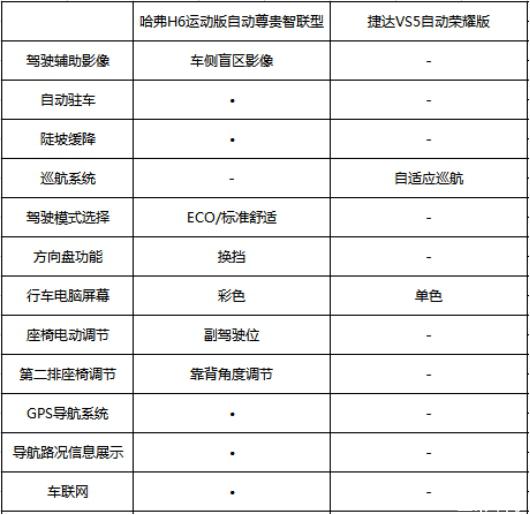 通過下表(僅列出部分配置)不難看出,哈弗H6運動版比捷達VS5多出了車側(cè)盲區(qū)影像、自動駐車、陡坡緩降、ECO/標準舒適、換擋撥片、液晶儀表盤、副駕駛座椅電動調(diào)節(jié)、第二排座椅靠背角度調(diào)節(jié)、導航路況信息展示、后排空調(diào)、車聯(lián)網(wǎng)、前排座椅加熱、GPS導航共計近20項配置,以碾壓之勢勝出。