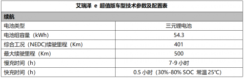 續(xù)航方面,艾瑞澤e超值版搭載54.3kWh的三元鋰電池,NEDC綜合續(xù)航里程為401km,最大續(xù)航里程可達500km,滿足用戶5天工作日在繁忙的城市間穿梭,2天周末或小長假帶上家人來一場說走就走的旅行,帶來“5+2”生活方式的新選擇。另外,快充模式下實現(xiàn)電量從30%到80%僅需30分鐘的"閃充"功能,即便長途出行或自駕游,也免去充電等待的焦慮問題。