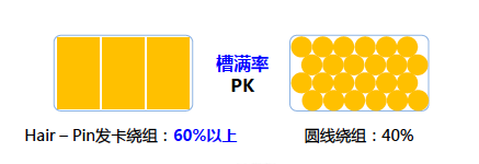 當(dāng)然,為了實(shí)現(xiàn)電驅(qū)動(dòng)輕量化,菲斯塔純電動(dòng)針對(duì)電機(jī)的定子線圈,使用截面積更大的扁形銅質(zhì)導(dǎo)線。這與幾何A采用的傳統(tǒng)的圓形銅線繞圈相比,可帶來更好的槽滿率,占積率從40%增加到60%,同時(shí)助整個(gè)電機(jī)質(zhì)量更輕,整體能耗也隨之下降。此外,菲斯塔純電動(dòng)的這種扁銅線繞組方法,不僅能增強(qiáng)熱傳導(dǎo)能力,提升散熱性能,還能帶來更高功率密度,為更強(qiáng)動(dòng)力表現(xiàn)夯實(shí)基礎(chǔ)。