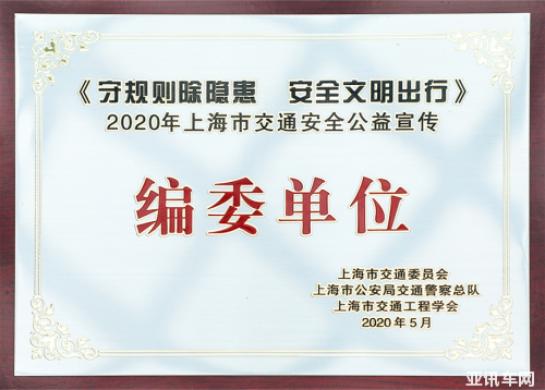2020年7月2日,上海市第二十個(gè)“無違法、無事故道路交通安全宣傳日”,奇瑞捷豹路虎作為《上海市民交通安全宣傳手冊》編委單位,受邀參加于7月2日舉辦的“幸盔有你 帶上安全”上海市“一盔一帶”安全守護(hù)行動(dòng)主題宣傳日暨《安全斑馬線》交通公益潮玩展啟動(dòng)儀式,并被授予支持單位榮譽(yù)銅牌與證書。
