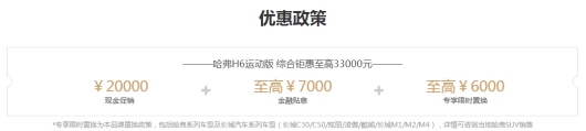 最為難得的是,這樣的“出攤神器”官方指導價僅需10.4萬起的價格就能輕松擁有,現(xiàn)在購車還可享受現(xiàn)金優(yōu)惠20000元、至高金融貼息7000元及至高限時置換補貼6000元,共計至高33000元超值鉅惠。且為滿足不同消費者的購車需求,哈弗H6運動版還推出1.68萬超低首付,24期0息及36期0息,月供低至1389元兩種貸款政策,在極大程度上降低擁有一輛高品質“國民神車”的門檻,為消費者減“付”。