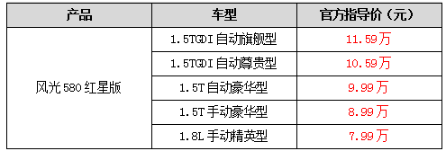 風(fēng)光580一直以來領(lǐng)銜著東風(fēng)風(fēng)光,而且它還一直是國產(chǎn)SUV品牌中的亮眼紅星??梢哉f,自從風(fēng)光580上市以來,它就受到了車主用戶的一致好評,此前的好評基礎(chǔ),使得風(fēng)光580紅星版的出現(xiàn)那么順理成章。此次風(fēng)光580紅星版的亮相,重新刷新人們對高品質(zhì)汽車生活的認識,再度突破性價比新高,讓人親切感受到風(fēng)光580的誠意。