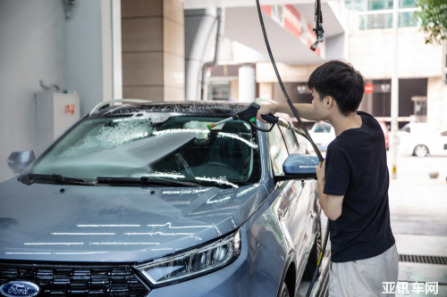 內(nèi)部清潔做完之后就是外部的清洗了,全車噴滿清潔劑再用高壓水槍進行沖洗的過程會重復三次。第一次噴清潔劑沖洗時,會把江鈴福特領界s的中網(wǎng)格柵、LOGO、尾標等外部細節(jié)部分進行清洗,第二次噴清潔劑沖洗時,他們會幫我清潔江鈴福特領界s的輪胎、車窗玻璃等,最后第三次噴清潔劑沖洗擦干之后,就算全部完工啦~