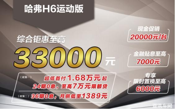 哈弗H6運動版此次帶來了綜合至高3.3萬鉅惠,包含2萬元現(xiàn)金促銷,至高7000元金融貼息、至高6000元專項限時置換三項,令小編都十分心動。同時考慮到手頭并不寬裕的消費者,哈弗H6運動版還準(zhǔn)備了多種0息貸款政策。一種是24期0息方式,首付超低只要1.68萬,特別適合存款較少的年輕人群;一種是36期0息方式,月供僅需1389元,換算為日供只要46.3元。此外,哈弗H6運動版還有3年或10萬公里質(zhì)保+首保免費福利,其后6萬公里總保養(yǎng)費用8216元,合計每公里保養(yǎng)費僅需0.14元!如此貼心的貸款方式,你是否感受到哈弗品牌顧客至上的誠心?