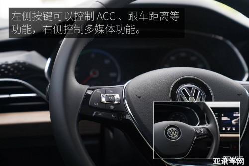 方向盤兩側(cè)分布了控制按鍵,左側(cè)可以控制 ACC 、跟車距離等功能。方向盤那右側(cè)分布了多媒體的控制按鈕,調(diào)節(jié)音量以及上下曲等。