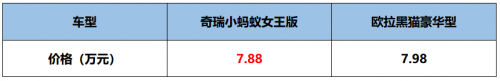 為公平起見,我們選擇了價(jià)格較為接近的售價(jià)7.88萬(wàn)元的小螞蟻女王版(以下簡(jiǎn)稱小螞蟻)和售價(jià)7.98萬(wàn)元的歐拉黑貓豪華型(以下簡(jiǎn)稱歐拉黑貓)兩款車型進(jìn)行對(duì)比。