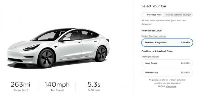 事實上,Model 3標準續(xù)航版自上市以來并未大規(guī)模銷售,特斯拉認為,消費者對標準續(xù)航升級版、長續(xù)航車型會更感興趣。根據(jù)特斯拉美國官網(wǎng)顯示,目前在售入門車型為標準續(xù)航升級版,其EPA續(xù)航里程為263英里(約423公里),售價為37990美元(約25萬元)。而國產(chǎn)特斯拉Model 3也并未推出標準續(xù)航版,目前在售的入門車型同樣為標準續(xù)航升級版,補貼后售價為24.99萬元。(消息來源:insideevs)