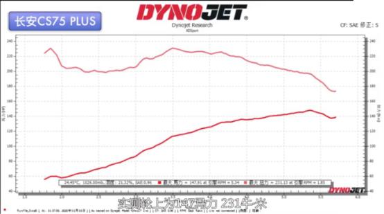 馬力機(jī)測(cè)試。長(zhǎng)安CS75 PLUS標(biāo)稱(chēng)178馬力,265牛·米,實(shí)測(cè)輪上為147馬力,231?!っ?。