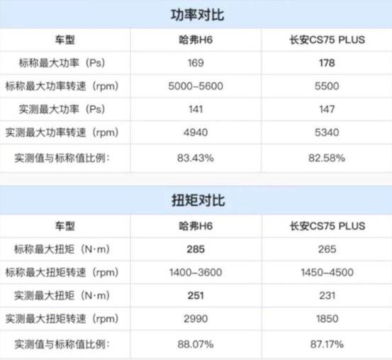 通過(guò)實(shí)測(cè)出的輪上數(shù)據(jù)與廠家標(biāo)定的數(shù)據(jù)的比值來(lái)看,第三代哈弗H6的表現(xiàn)是比較好的。