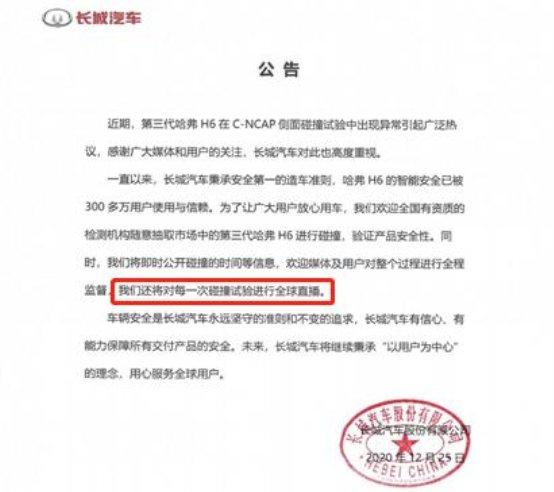 作為擁有全球300萬多萬名車主的“神車”,哈弗H6的產(chǎn)品質量以及安全問題自然要接受大眾的評判,然而這次的結果顯然不是大家想看到的。事情發(fā)生后,哈弗品牌官方率先做出了回應,其表示,“初步診斷為車輛在碰撞時處于斷電狀態(tài),導致側氣囊和側氣簾沒有彈開”。隨后,12月25日,長城汽車再發(fā)聲明,歡迎全國有資質的檢測機構隨意選取市場中的第三代哈弗H6,且愿意公開進行碰撞檢測,并全球直播每一次碰撞試驗。