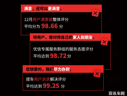 中國(guó)領(lǐng)先的二手車在線商城優(yōu)信近日發(fā)布了12月份服務(wù)月報(bào),本月用戶滿意度整體評(píng)分高達(dá)98.66分,達(dá)到歷史最高水平。其中專屬服務(wù)群組的服務(wù)態(tài)度評(píng)分平均達(dá)到98.72分,提車后用戶投訴解決分達(dá)99.25分,有效解決用戶用車問(wèn)題。