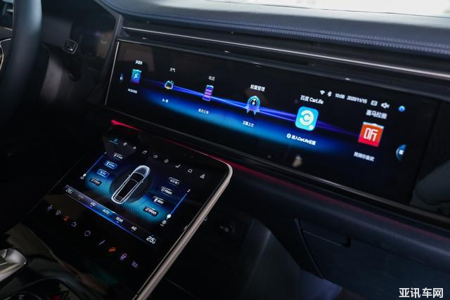 坐進(jìn)車廂內(nèi),我首先就被三塊液晶屏吸引住了,其中最醒目的要數(shù)中控正中央那塊20.3英寸的超寬帶魚屏,它應(yīng)用了4K視網(wǎng)膜技術(shù),畫質(zhì)清晰,靈敏度以及觸控響應(yīng)也算同級(jí)中上游水準(zhǔn)。