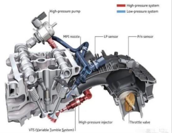 大眾EA888三代采用了雙噴射系統(tǒng),意思就是每個氣缸有兩個噴嘴,其中一個是200bar噴射壓力的GDI直噴噴油器,另一個是PFI氣道噴射噴油器。這樣的做法好處是:低速低負荷使用PFI氣道噴射以達到降低顆粒物排放和油耗的目的;大負荷發(fā)揮GDI直噴的性能優(yōu)勢,達到駕駛目的。這種雙噴射系統(tǒng)是在不改變原來側(cè)置直噴結(jié)構(gòu)的情況做出的一種優(yōu)化方案,在豐田和日產(chǎn)的2.0T上也能看到類似的設(shè)計理念。