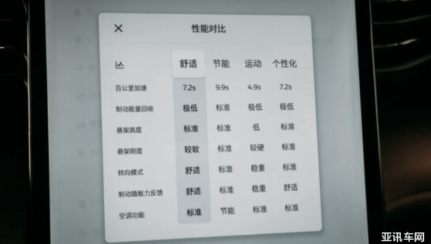 而且非常貼心的是,為了方便駕駛者對(duì)每種駕駛模式的特性一目了然,蔚來(lái)ES8還專(zhuān)門(mén)列舉了不用模式下具體的車(chē)輛設(shè)定。這里就不得不提一嘴動(dòng)能回收,只有在節(jié)能模式下,蔚來(lái)ES8才會(huì)提供標(biāo)準(zhǔn)動(dòng)能回收,其他模式均默認(rèn)為極低,因此習(xí)慣了燃油車(chē)特性的駕駛者,也不會(huì)被拖拽感的問(wèn)題所困擾。
