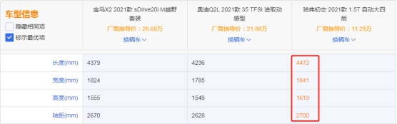 從表面來看,豪車與平民車最大的差距是什么?我想一定是:長,外表長,內(nèi)里也長。我們以入門級豪車寶馬X2、奧迪Q2L為例,從空間表現(xiàn)上來看,在級別相似的情況下,哈弗初戀擁有長寬高全面領(lǐng)先的優(yōu)勢,駕乘舒適性方面的優(yōu)勢想必不用多說。