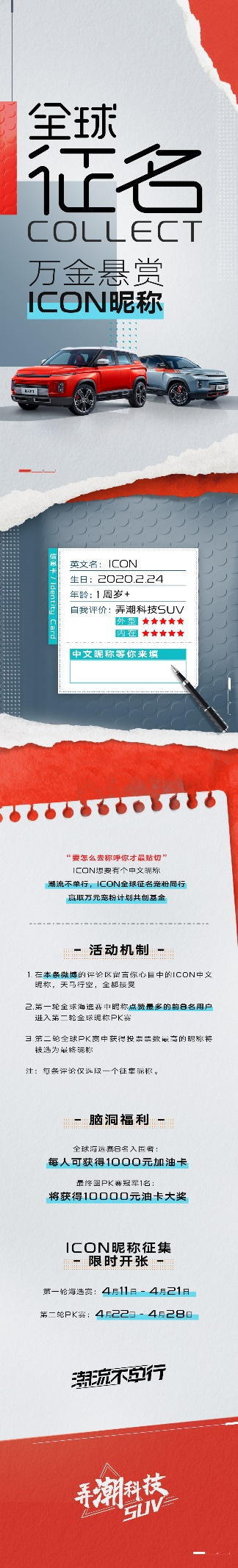 吉利ICON中文昵稱征集仍在火熱進(jìn)行中,快來(lái)貢獻(xiàn)出你的腦洞,Pick你最愛的名字,送TA“出道”,和ICON一同走花路!想想自己的“愛豆”以后就用自己取的小名了,這個(gè)小名會(huì)陪伴ICON收獲更多的“粉絲”,贏得更多的青睞,登上更大的舞臺(tái),是不是有一種驕傲的感覺呢?
