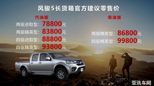 為了滿足不同消費者的用車需求,風駿5長貨箱涵蓋汽油/柴油兩種動力,提供兩驅/四驅兩種驅動形式。其中,柴油版車型兩驅精英型官方指導價86800元,四驅精英型官方指導價99800元;汽油版車型兩驅進取型官方指導價78800元,兩驅精英型官方指導價83800元;四驅進取型官方指導價88800元,四驅精英型官方指導價93800元??梢哉f,7-9萬元的價格區(qū)間,以絕對的性價優(yōu)勢,讓廣大商用皮卡用戶趨之若鶩。