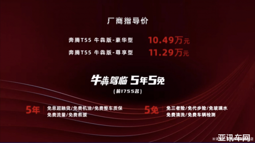 現(xiàn)在問題來了,這么卓爾不群的車,會(huì)不會(huì)很貴呢?不用擔(dān)心,一汽奔騰考慮到要讓用戶購車無憂、用車無憂、養(yǎng)車無憂,將目前的“嘗鮮價(jià)”定為10.49-11.29萬元。同時(shí),下單購買奔騰T55牛犇版的用戶還能享受5年免費(fèi)整車質(zhì)保、5年免費(fèi)機(jī)油、5年流量無憂、5年道路救援、5年免息超融貸等“5年”購車政策,以及獲得由免三者險(xiǎn)、免代步險(xiǎn)、免玻璃水、免車輛檢測、免車輛清洗等構(gòu)成的“5免”政策。怎么,心動(dòng)了嗎?心動(dòng)就趕緊買它吧!