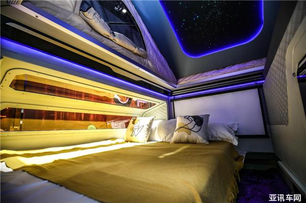 最令人驚喜的還是旅裝炮的車內(nèi)空間,超大雙人床、可升降式結(jié)構(gòu)車頂部帳篷、可調(diào)星空頂光纖燈帶,還可以個性化定制內(nèi)部空間裝飾,簡直是移動小別墅。當(dāng)然,配合強大的越野能力,旅裝炮能帶你去其他露營車到不了的地方。