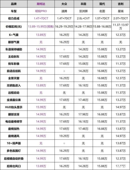 而在具體的各類功能方面,明銳 PRO 在無鑰匙進入、全液晶儀表、電動座椅調(diào)節(jié)、座椅加熱及通風,以及后視鏡自動折疊等方面,價格門檻都比速騰要便宜 3 萬左右。