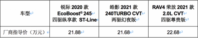 在對比車型選擇上,為了讓大家能更直觀感受到同等價位下三款車型的不同特性,我們選取指導(dǎo)價格相近的車型來進行比較: 21.88萬元的銳際2020款EcoBoost? 245四驅(qū)縱享款 ST-Line、21.68萬元的皓影2021款240TURBO CVT兩驅(qū)幻夜版,以及22.68萬元的RAV4榮放2021款2.0L CVT四驅(qū)尊貴版。