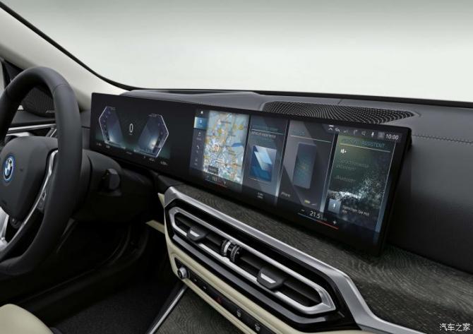 新車(chē)內(nèi)部最為吸睛的部分當(dāng)屬中控臺(tái)上矗立的雙聯(lián)屏。與iX上的雙聯(lián)屏一樣,i4上的這塊屏幕也采用了曲面設(shè)計(jì),觸控顯示屏的尺寸為14.9英寸,全液晶儀表的尺寸為12.3英寸。偏向駕駛員的整體位置進(jìn)一步突出了新車(chē)專(zhuān)注駕駛員的定位。同時(shí)最新的iDrive 8.0系統(tǒng)也出現(xiàn)在了這塊屏幕上,能與駕駛模式聯(lián)動(dòng)的它不僅讓使用體驗(yàn)進(jìn)一步升級(jí),在視覺(jué)效果上也更上一層樓。