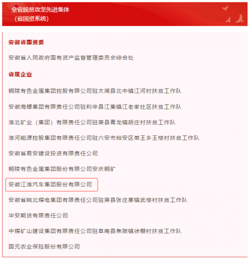 近日,據(jù)“中共安徽省委安徽省人民政府關(guān)于表彰安徽省脫貧攻堅先進個人和先進集體的決定”公布,安徽江淮汽車集團股份有限公司獲授“全省脫貧攻堅先進集體”稱號。