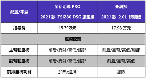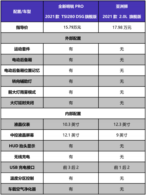 在兩款車(chē)的內(nèi)外配置對(duì)比中,全新明銳PRO真正做到了一臺(tái)頂配車(chē)型應(yīng)有的樣子,而售價(jià)更高的亞洲獅則顯得吝嗇許多。