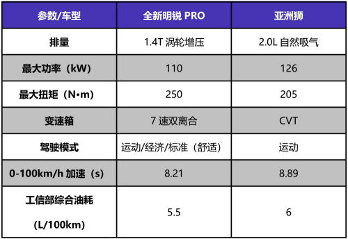 從參數(shù)上可以看出,全新明銳PRO搭載了1.4T渦輪增壓發(fā)動(dòng)機(jī),最大功率110kW,最大扭矩250N·m,匹配7速雙離合變速箱。而亞洲獅則搭載了2.0L自然吸氣發(fā)動(dòng)機(jī),最大功率126kW,最大扭矩205N·m,匹配CVT變速箱。全新明銳PRO不僅百公里加速比亞洲獅快,更重要的是油耗也比亞洲獅低,真正做到了高效且省油,極大降低了使用成本。