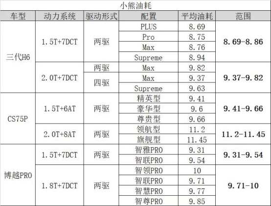 而2.0T車型對比中,第三代哈弗H6中間值為9.6L,長安CS75 PLUS為11.3L,吉利博越PRO約為9.8L,第三代哈弗H6的燃油經(jīng)濟性明顯依舊具有充足優(yōu)勢。