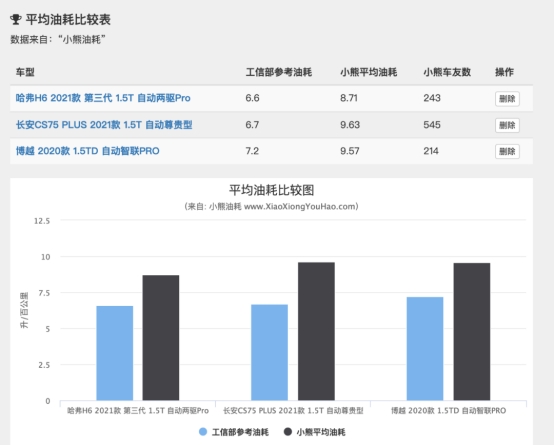 眾多消費(fèi)者在購車的時候,油耗表現(xiàn)絕對是最關(guān)注的方面之一,畢竟現(xiàn)在油價持續(xù)上漲,用車成本也不斷增加,所以考察油耗就可以衡量出一款車的綜合實(shí)力。小編為更加直觀的考察第三代哈弗H6的油耗表現(xiàn),選擇了長安CS75 PLUS和博越PRO的同排量車型,并在最近被車主廣泛使用的小熊油耗APP上做出比較,結(jié)果是第三代哈弗H6更加省油。