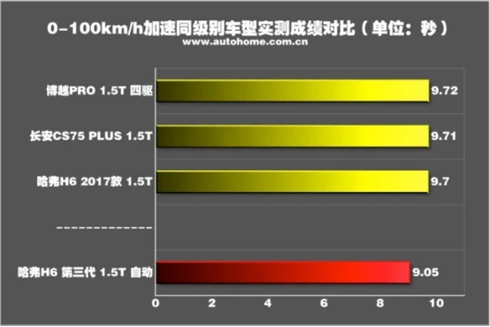 還有,第三代哈弗H6的發(fā)動機(jī)也擁有較好的機(jī)械素養(yǎng),最大扭矩可以達(dá)到285牛米,這個數(shù)據(jù)要比長安CS75 PLUS和博越PRO都要高。扭矩更高同時也讓汽車的起步加速感更好,并在1400轉(zhuǎn)就可以輸出最大扭矩,以及雙離合變速箱更快的反應(yīng)速度等因素,都讓第三代哈弗H6的加速更快。根據(jù)汽車之家的測試,第三代哈弗H6加速成績達(dá)到了9.05秒,而博越PRO 的加速成績只有9.72秒,長安CS75 PLUS也只有9.71秒,充分反應(yīng)出第三代哈弗H6的技術(shù)水平。