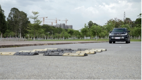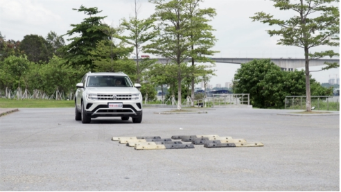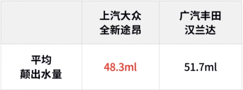 隨后是減振測試。我們設(shè)置了4組連續(xù)的減速帶,每組間隔為1米。讓車輛以20km/h的車速勻速通過減速帶,量杯灑出的水量為判斷其底盤濾振能力的依據(jù),灑出的水越少說明舒適性越好。重復(fù)測試3次,以減小誤差。測試結(jié)果同樣是上汽大眾全新途昂處于上風(fēng),它的平均顛出水量僅為48.3ml。而漢蘭達的平均顛出水量則為51.7ml。