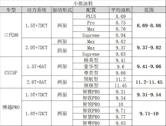 當(dāng)然了油耗水平自然不能只看技術(shù)與動(dòng)力數(shù)據(jù),而是應(yīng)該將話語(yǔ)權(quán)交給車(chē)主。因此,為了驗(yàn)證第三代哈弗H6技術(shù)實(shí)力,小編特別選擇了兩款同級(jí)熱銷(xiāo)車(chē)型——長(zhǎng)安CS75 PLUS、吉利博越PRO,進(jìn)行測(cè)評(píng)。數(shù)據(jù)均采集自小熊油耗APP以保證公平性,最終匯總?cè)缦拢?/span>