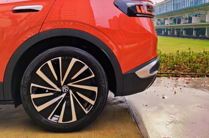上汽大眾ID4 X的車身側(cè)面有著較多亮點的設計元素,其中車窗上半部分的銀色鍍鉻裝飾條,完美地呼應了雙色車身,此外新款車型的車窗下沿進行了內(nèi)凹的處理,有效保證了側(cè)窗的采光面積。新車底部的輪轂造型同樣非常新能源,為了降低風阻該輪轂做了平面化的處理,并且應有雙拼配色,整個造型比較耐看。