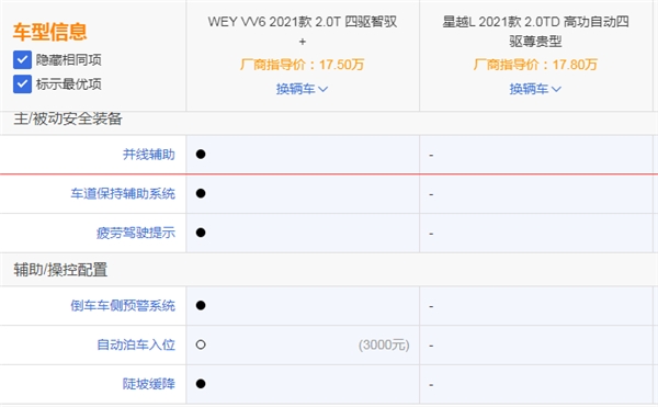 相信各位老司機都知道長途駕車的煎熬,所以這一次我下定決心買一輛智能性更先進(jìn)的車型。我們可以看到,WEY VV6搭載了L2+級智能駕駛輔助系統(tǒng),而星越L只有L2級。且WEY VV6相較于星越L還多了智能轉(zhuǎn)彎、FCW前碰撞預(yù)警、駕駛疲勞檢測系統(tǒng)等功能,不僅可以讓我長時間開車時得到適當(dāng)放松,還能讓我剛拿駕照的妻子駕駛起來更放心。