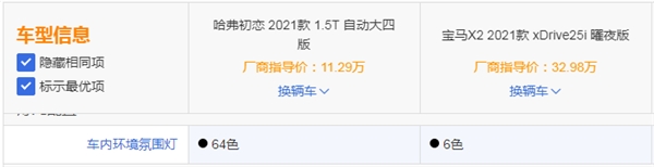 哈弗初戀搭載的是豪華越級(jí)64色氛圍燈,可以帶給你豐富的體驗(yàn)與享受,相比于官方指導(dǎo)價(jià)32.98萬元頂配版的寶馬X2身上僅擁有6色氛圍燈,二者相差20萬的價(jià)格,顯然是哈弗初戀更超值。