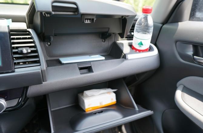 前排的空調(diào)出風口和杯架的一體式設(shè)計,飲料或是水放在這里,冬暖夏涼;另外在副駕駛中控上方工程師還設(shè)計了一個儲物格,像日常的錢包、票據(jù)、紙巾等物品都可以放在里面,隨取隨用,簡直不要太方便。