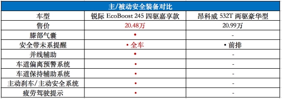 和擁有豐富安全配置的銳際相比,昂科威的eProtect智能安全系統(tǒng)在配置上就略顯誠意不足。通過表格我們不難看出,銳際的那些實用安全配置并沒有出現(xiàn)在昂科威這款車型的清單之上。而且昂科威也并未匹配膝部氣囊,這對于多多益善的用戶需求來說,昂科威的安全配置算不上豐富,只能算得上夠用。
