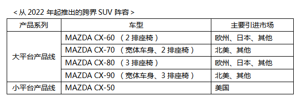 為應(yīng)對全球持續(xù)增長的SUV細(xì)分市場,也為了向用戶提供更多兼具最新環(huán)??萍己婉{乘愉悅的車型選擇,馬自達(dá)計(jì)劃在2022年至2023年間推出“MAZDA CX-50”、“MAZDA CX-60”、“MAZDA CX-70”、“MAZDA CX-80”以及“MAZDA CX-90”5款跨界SUV車型。