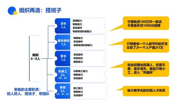 集群車寶董事長高集群說“一個(gè)美容快保店人員架構(gòu)在6-8人之間,只有充分解決員工團(tuán)隊(duì)的內(nèi)部問題,搭建高效的門店團(tuán)隊(duì),門店才有發(fā)展。沒有解決門店團(tuán)隊(duì)問題,老板頂多帶的是團(tuán)伙,一片散沙,談何發(fā)展!”