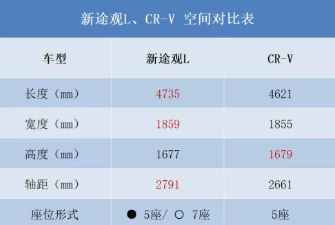 新途觀L不僅顏值在線,空間更是高出一級(jí)。新車長(zhǎng)寬高分別為4735/1859/1677mm,軸距更是達(dá)到2791mm,整體比CRV要大一圈(如上表格所示)。更長(zhǎng)的軸距也意味著新途觀的內(nèi)部空間更為舒適寬敞。另外,其還提供了5/7座車型可選,7座車型采用2+3+2的布局,為多人出行提供了更多的可能。