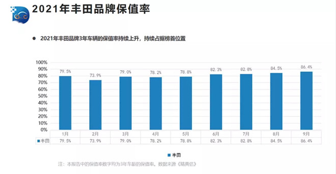 10月9 日,在中國汽車流通協(xié)會發(fā)布的《2021年9月中國汽車保值率研究報告》中,豐田品牌汽車3年86.4%的保值率讓豐田繼續(xù)笑傲群雄。值得注意的是,2021年豐田品牌3年車輛的保值率呈現(xiàn)持續(xù)上升的態(tài)勢,而且也是持續(xù)占據(jù)著榜首位置。