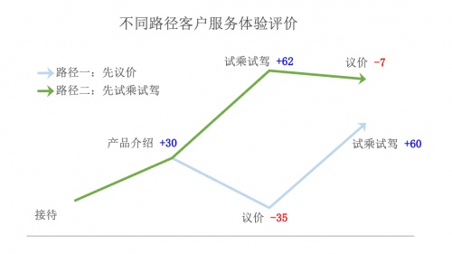卓思研究發(fā)現(xiàn),過早的議價(jià)會弱化客戶對產(chǎn)品和服務(wù)的體驗(yàn),讓客戶過分關(guān)注價(jià)格本身,而非產(chǎn)品價(jià)值。議價(jià)環(huán)節(jié)是服務(wù)流程中的體驗(yàn)負(fù)效應(yīng)環(huán)節(jié),各個(gè)品牌無一例外?!跋茸h價(jià)”比“先試駕”,客戶的體驗(yàn)評價(jià)有明顯的降低,而即便后補(bǔ)其它環(huán)節(jié)的體驗(yàn),“先議價(jià)”的總體評價(jià)仍然比“先試駕”低,成交轉(zhuǎn)化率也較低。