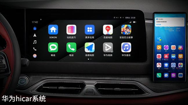 內飾方面紅黑搭配,紅色為主要顏色,使其運動感體現的淋漓盡致,同時新車采用了7英寸全液晶儀表盤加12.3英寸中控多媒體觸控屏的雙聯屏設計,搭配雙輻式多功能方向盤以及電子換擋機構,科技感十足,值得一提的是中控屏采用的是華為HiCar車機系統(tǒng),一體化無感連接縱享絲滑。