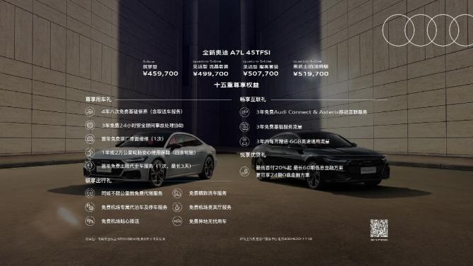 同時(shí),全新奧迪A7L 45TFSI車型迎來(lái)首秀,并正式啟動(dòng)預(yù)訂。全新奧迪A7L 45TFSI共3款車型,售價(jià)為45.97萬(wàn)元至50.77萬(wàn)元,所有車型均可獲得15重“尊享服務(wù)權(quán)益包”。全新奧迪A7L 45TFSI入門車型即搭載了180kW高功率發(fā)動(dòng)機(jī),同時(shí)標(biāo)配包括5G/V2X技術(shù)、高清矩陣式LED大燈帶動(dòng)態(tài)轉(zhuǎn)向燈、定速巡航系統(tǒng)、奧迪虛擬座艙增強(qiáng)版、前排運(yùn)動(dòng)座椅、無(wú)框車門等在內(nèi)十五項(xiàng)裝備,甄選車道偏離預(yù)警及回正與組合式前部預(yù)碰撞安全系統(tǒng),讓駕駛者能夠從容應(yīng)對(duì)、智享出行。