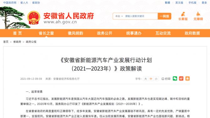 2021年9月,安徽省根據(jù)國家《新能源汽車產業(yè)發(fā)展規(guī)劃(2021-2035)》和省委省政府關于制造強省的決策部署,省經濟和信息化廳組織起草了《安徽省新能源汽車產業(yè)發(fā)展行動計劃(2021-2023年)》。