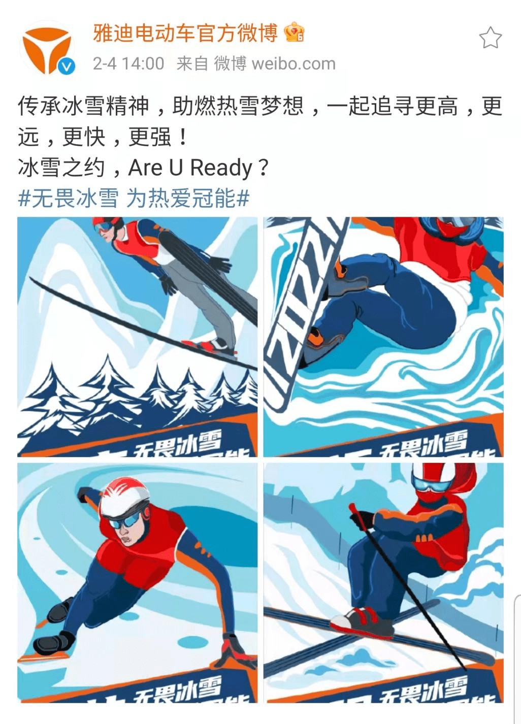 在雅迪電動(dòng)車(chē)推出的“無(wú)畏冰雪,為熱愛(ài)冠能”系列短片中,中國(guó)花樣滑冰世界冠軍張丹、單板滑雪世界冠軍張義威及單板滑雪全國(guó)冠軍張嘉豪以自己的奪冠故事,對(duì)“熱愛(ài)”“夢(mèng)想”“拼搏”給出了獨(dú)特的詮釋。同時(shí),聚焦主題,雅迪電動(dòng)車(chē)在冰雪盛會(huì)的開(kāi)幕、運(yùn)動(dòng)員奪冠等重要節(jié)點(diǎn)輸出創(chuàng)意海報(bào)、祝福視頻,傳遞核心價(jià)值,以微博、小紅書(shū)等社交平臺(tái)為載體,通過(guò)冠軍故事吸引更多用戶(hù)參與到為冰雪運(yùn)動(dòng)健兒加油助威的活動(dòng)中,不斷深化人們對(duì)冰雪運(yùn)動(dòng)的認(rèn)知理解。隨著冰雪盛會(huì)的不斷深入,雅迪電動(dòng)車(chē)”無(wú)畏冰雪,為熱愛(ài)冠能”的主題信息快速破圈,讓雅迪贏(yíng)得更多用戶(hù)的關(guān)注,更迅速觸達(dá)至年輕消費(fèi)群體中。
